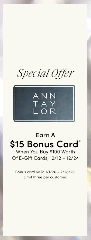 Valid only as marked on in stock sale styles. Discount is for a limited time and excludes tax and shipping. International orders are ineligible unless otherwise stated. Not redeemable for cash or, except as stated in our Return Policy, adjustments to prior purchases. Items marked Final Sale are not eligible for return. Not combinable with coupons or other discounts unless otherwise stated. Valid only in Ann Taylor stores and at anntaylor.com 1/13 - 1/17/2023 (ends 2:59 a.m. ET online).